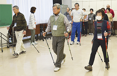 初回の11月15日には、障害者スポーツ文化センター横浜ラポールの宮地秀行さんの指導のもと、ノルディックウォーキングの特徴や効果、ポールの持ち方などを学習。宮地さんは「ポールが杖のようにも見えるため、(周囲の人から)杖をついていると思われることでめげてしまう人もいるが、その時こそチャンス。知らない人に良さを教えてあげて仲間に引き込んでほしい」と楽しく継続する秘訣をアドバイスした。その後、悪天候により室内で歩行を実践、それぞれがコツをつかんだ。今後2回の講座では、いたち川沿いのウォーキングを楽しむ予定だ。