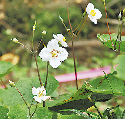 シラユキゲシは別名スノーポピーとも呼ばれており、白色5枚の花弁からなる。原産国は中国で、全草干したものは解毒や皮膚病の薬として栽培されていたという。山地の林や日陰、湿地などを好み、上郷市民の森では見晴台広場へ向かう中腹あたりに群生している。