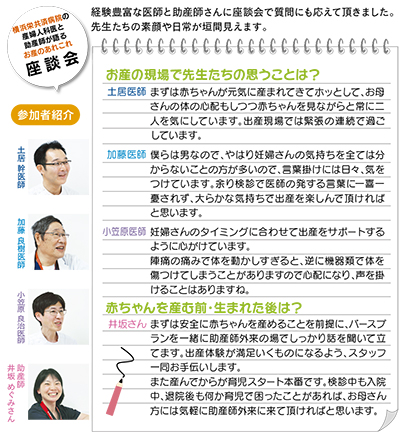 最後に土居医師は「元気な赤ちゃんの誕生と母体の安全を守りながら分娩をサポートいたします」と話し、加藤医師は「助産師11人、看護師6人の17人態勢は非常に手厚い。妊婦さんは安心して入院生活を過ごすことができると思います」小笠原医師は「妊娠中の薬のこと、旅行などの外出など気がかりなことは何でも気軽に聞いて下さい」助産師の井坂看護部主任は「助産師外来で十分に話を聞き、バースプランに沿った思い出に残る出産体験ができるようにお手伝いします」と、それぞれ産科再開への意気込みなどを語った。