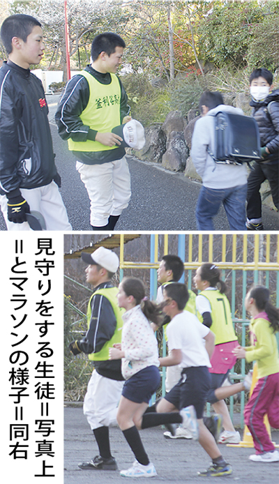 この日は早朝から野球部員7人が同小学校のマラソンクラブに参加。高学年の児童約50人とともに校庭を走り、汗を流した。その後部員は小学校付近の交差点に立ち、登校の見守り活動を実施した。