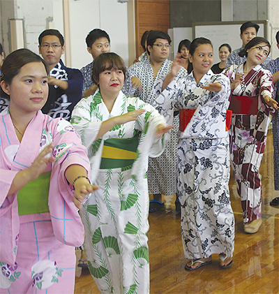 演奏された曲目は「炭坑節」や「東京音頭」など。色とりどりの浴衣に身を包んだ研修生は熱心に、時おり笑顔を見せて踊っていた。ミコ・ラスナベさん(22)は「故郷のダバオでも盆踊りをしたことがある。本場の日本でまた踊ることができて嬉しい」と話していた。