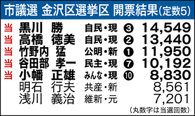 横浜市議選金沢区選挙区は定数5議席を巡り、現職4人と元職1人、新人2人が激しい選挙戦を繰り広げた。