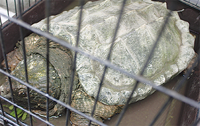 称名寺阿宇ケ池で4月12日、池に住み着いていたワニガメが捕獲された。