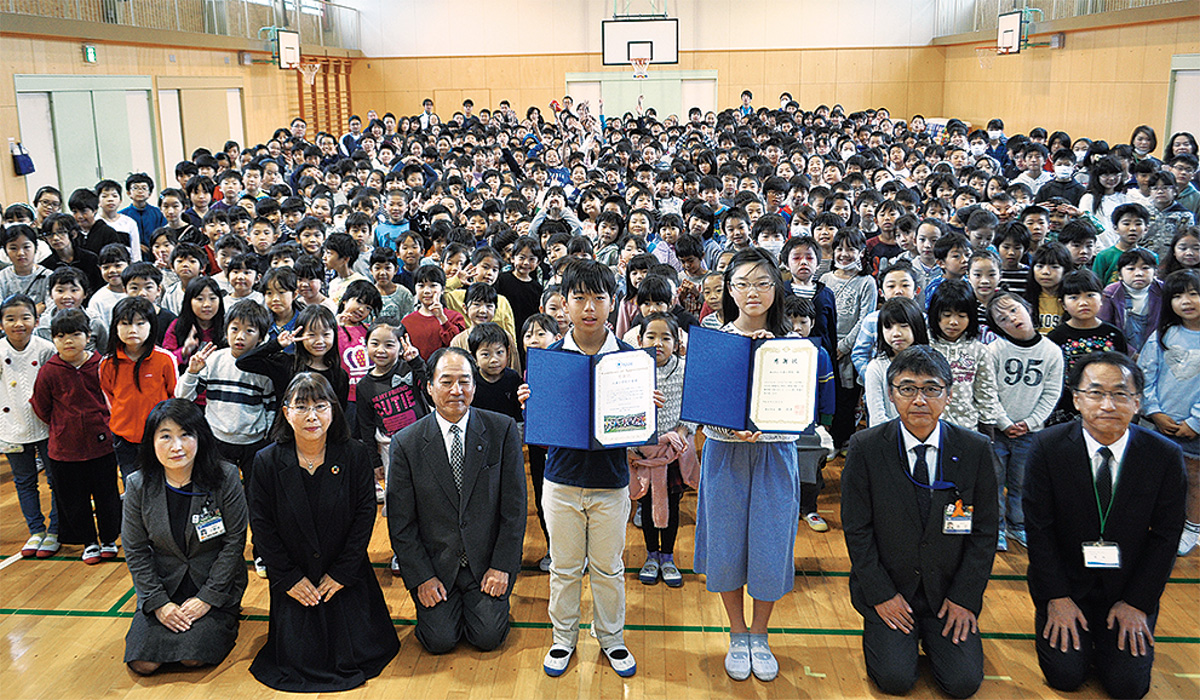 当日は児童を代表し高橋海さん(5年)と木下陽香さん(4年)がそれぞれ夏休みに実践した「電気をこまめに消す」「シャワーを使わず、湯船のお湯で頭を洗う」「自分の水筒を持っていく」などの実践例を発表。国連WFP協会と横浜市から感謝状を受け取った。同協会の鈴木邦夫事務局長は「皆さんの頑張りで、ミンダナオ島に27万5千本の植樹ができた。これからも前向きにエコ活に取り組んで欲しい」とメッセージをおくった。