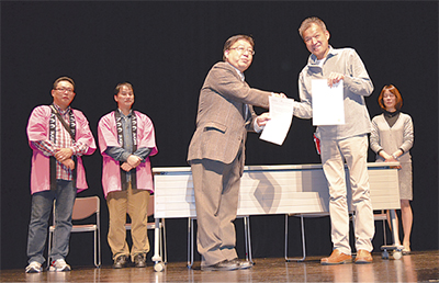 締結式はこの日、杉田劇場で開催された、区民有志団体「横浜杉田 気仙沼応援隊」(山口昭代表)による防災減災講演会の冒頭で行われた。講師として会場を訪れた復興商店街・南町紫市場の坂本正人副理事長と、プララ杉田の佐藤会長が、両商店街関係者と共に登壇。地域住民など多くの聴衆が見守る中、署名を行い、協定書を取り交わした。