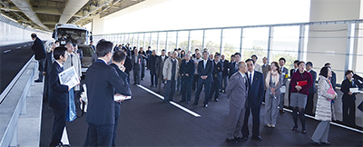 その後、出席者たちはバスで三溪園付近まで移動し、実際に開通前の道路を走行。途中でバスを降りると、完成間近の道路を写真に収めたり、出席者同士で記念撮影をしながら、悲願の道路の完成を祝った。