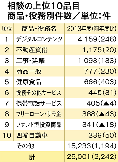 相談内容で最多だったのは12年度と同様、アダルトサイトや出会い系サイトなどの「デジタルコンテンツ」に関するもので、全体の16・6%を占める4159件。ケースとしては「スマートフォンや携帯電話に届いた迷惑メールをクリックしたところ、不審なサイトが開き料金を請求された」といったものが多い。