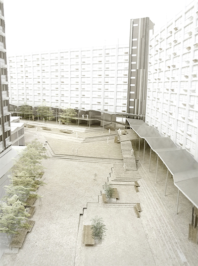 独立行政法人都市再生機構(UR都市機構)はこのほど、団地の再生を図る事業「団地の未来プロジェクト」を洋光台団地でモデル始動すると発表した。これまで主に通路となっていた広場を改修し、外部に開放。まちの交流拠点とする。