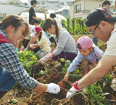 NPO法人ヒューマンフェローシップが管理する岡村の「にこまるソーシャルファーム」で10月24日、さつまいもの収穫祭が行われ根岸地区周辺の住民などが参加した=写真。