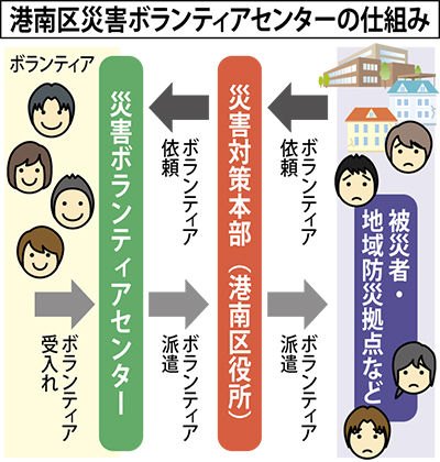 そんな教訓から生まれた考えが、災害時にボランティアの受け入れ拠点として設置する「災害ボランティアセンター」。支援要請にあわせて効率的にボランティアを派遣する”調整役”を担うもので、港南区では、この立ち上げに同ネットワークが携わり、区役所に設置される災害対策本部を通じ、区民が利用する32カ所の防災拠点や被災者からの依頼を受け付けるという。