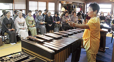 コンサート開始前には亀野哲也住職が「一般的に寺院は元々落語などが催され、地域の人々が集まる場所だった」と説明。その後マリンバ奏者の市瀬孝子さん、ピアニストの渡辺藤子さんの演奏が開始。「愛のあいさつ」「愛の喜び」「マリンバフラメンコ」などが披露されたほか、飛び入りで児童がマリンバを演奏したり、童謡の「故郷」を全員で歌う場面も。また、休憩時間にはお茶とお菓子が振る舞われ、コンサート終了後にはチューリップが一輪ずつ手渡された。