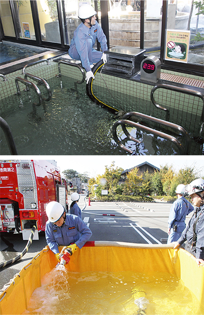 11月6日には、実際に同店の湯を消火活動に活用できるかを検証するための訓練を実施。同店の浴槽は消火用の施設ではないため、ホースを消防車に直接つなぐことはできず、消防団の保有する小型の可搬式ポンプで浴槽から吸水し、水槽に貯水。水槽から消防車に接続し、放水を行った。水槽に1度貯めることは、水温を下げてポンプへの負担を減らすことに加え、複数ある浴槽の湯を1カ所に集め、長時間安定して放水するための工夫だという。