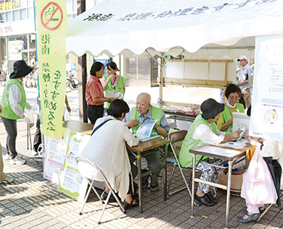 港南禁煙・分煙をすすめる会(中山脩郎(みちお)代表)は8月1日、上永谷駅前の広場で、禁煙キャンペーンを実施した。