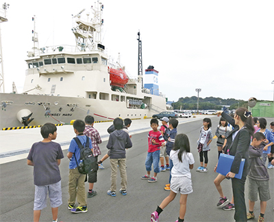 同事業は今年で3年目。当日は日野南小学校の児童や保護者など64人が参加。同所には東日本大震災による自然変動などを調査する研究船「新青丸」が停泊していたほか、有人潜水調査船「しんかい6500」の実物大模型なども展示されており、子どもたちはコックピットの内部を体験した。 またカップ麺の容器を使って水圧の実験も行い、容器が3分の1ほどの大きさに圧縮されると、子どもたちは驚きの声を上げていた。淡路会長は「今後も楽しみながら学べるものを企画していきたい」と話していた。