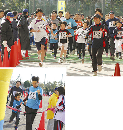 また、小学1年生から3年生とその保護者が一緒に走るファミリーの部で出場し、第1組で1位(総合3位)となった小原史彦さん・直也君親子は「1カ月前から練習して、正月休みも一緒に走りました。うれしい」と声を弾ませていた。