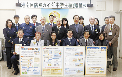 港南区役所、港南消防署、港南区中学校長会、地域住民の協力によりこのほど、中学生向けの防災啓発リーフレット「港南区防災ガイド・中学生編」が作成された。子育て世代への啓発も視野に入れ、4月以降、区内中学校の全生徒に配布される予定だ。