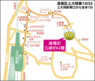 今年のひまわりフェスタは7月23日午前9時30分から正午まで(雨天時は翌日順延)。ひまわり畑の場所は、上大岡東1の34(詳細は上記地図参照)。問い合わせは、上大岡駅東口商店会事務局(【電話】045・845・4187、※ひまわりフェスタ当日のみ【電話】045・846・1187)へ。