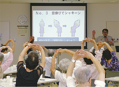 冒頭で港南署の救急救命士・藤本賢司さんが、救急現場から考えたケガの予防対策や体操を説明し、実際に参加者全員で体操も実践。その後は、芹が谷消防出張所の荒井康彰所長が火災予防や防災、減災対策などを紹介した。