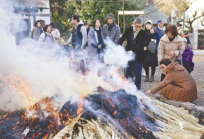 寒空の下、境内には地域住民ら約150人が参列。川辺宮司によって神事が執り行われた後、中央に集められた飾りになどに火がつけられた。参列者は勢いよく燃える焚き上げの周りを囲み、暖を取りながら静かに祈っている様子だった。
