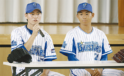 横浜DeNAベイスターズの今永昇太投手(23)と砂田毅樹投手(21)が先月27日、港南区の桜岡小学校をサプライズで訪れ、夢をテーマにした特別授業で児童たちと交流した。
