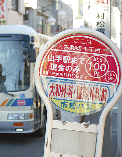 横浜市交通局は9月1日から、中区大和町エリアを走る市営バスの区間で、運賃をワンコイン(100円)とする社会実験をスタートさせた。徒歩からバス利用への転換を促進し、収益向上を目指す取り組みの一環として実施されるもので、期間は11月30日まで。