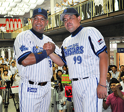 今年4月と5月に相次いで2000本安打を達成させた横浜DeNAベイスターズのアレックス・ラミレス選手と中村紀洋選手が7月3日、横浜市庁舎を訪れ林文子市長や市民に記録達成の報告を行った。