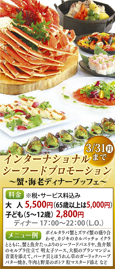 横浜港を目前に望むブッフェ・ダイニング「オーシャンテラス」では「インターナショナルシーフードプロモーション〜蟹・海老ディナーブッフェ」を開催中。