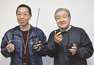 無線の活用を提案したのは、同区域内の久保町第三自治会の細田正会長=写真左。「避難が必要な大規模災害時に、行政からの連絡は地域防災拠点までは来るが、それ以外の避難所や自宅に残る住民がどう情報を得るか、前から不安だった」と細田さん。震災を機に、20年来の趣味のアマチュア無線の知識を活かし、誰でも簡単に扱える「デジタル簡易無線」の活用を天笠さんに呼びかけた。1台3万円程度と安くはないが、「災害時は携帯も使えなくなる。住民の安否確認や避難誘導、食糧の効率的な配布などに活用できれば」と協議会の資金での購入を決めた。一昨年から導入を進め、現在は各会長など16町内会で35台を保有する。