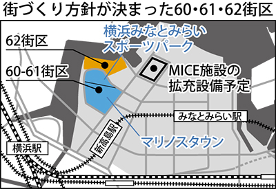 横浜市は2月25日、マリノスタウンと横浜みなとみらいスポーツパークが位置するみなとみらい21地区の60・61街区、および空き地となっている62街区の計約8・3haについて、「観光・エンターテイメント」を軸にした方針で街づくりを進めることを決めた。同地区で市が街区ごとに具体的な街づくりの方向性を示すのは初めて。