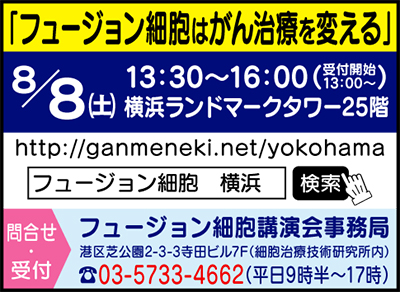 がんの3大治療法と言われる外科手術、化学療法、放射線療法。これらに続く新たな治療法として、今「フュージョン細胞」を使ったがん免疫治療が注目を集めている。その免疫治療に関する講演会、「『世界レベルで進むがん研究、進化するがん免疫治療』〜フュージョン細胞はがん治療を変える〜」が8月8日(土)、TKP横浜ランドマークタワー25階で開催される。