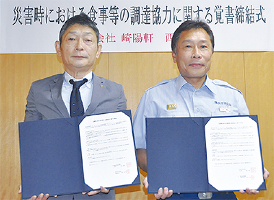 西消防署(中嶋敏明署長)と(株)崎陽軒が9月16日、災害時の調達協力に関する覚書を締結した。
