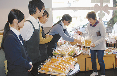 中区本牧間門の老舗ベーカリー「本牧館」で11月21日、県立商工高校=保土ケ谷区=の生徒がオリジナル創作パンの販売会を行った。