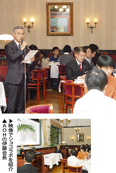 会場では、AOHの伊藤会長が作成した紹介映像を放映し、参加した遊技場組合のメンバーらがショコラボの活動に理解を深めた。その後、高級フレンチ料理が振る舞われ、楽しい一時を過ごした。