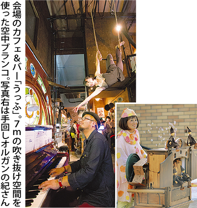 横浜音祭りの一環で、横浜市在住の手回しオルガン奏者の紀あささんらが出演。会場のカフェ&バー「うっふ」(桜木町駅8分)の雰囲気ある店内も見どころの一つ。演奏や空中ブランコの体験コーナーも。「間近で見られるサーカスを楽しんでもらえたら」と主催者。