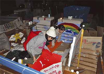 今回の避難所訓練はその集大成のひとつとなるもの。昼間は、避難所生活で必要となりそうなものを各自で考えて持参し、避難所となる体育館の区割りや仮設トイレの組み立てを行い、持ち寄った非常食で食事をとった。そして、一度帰宅してから夜の部のために再登校。災害時の停電を想定して、真っ暗な校舎の中から毛布などを体育館に運び、持参したライトを使いながら寝床を作り、宿泊訓練を行った。2日前に雪が降ってこの日も寒さの厳しい中、段ボールを重ねたり寝袋の中に毛布を入れるなど独自の工夫で防寒対策をした児童たち。出石咲楽さんと小澤結衣さんは「夜の暗い校舎は怖かった。でもみんなで協力すれば怖くないし、大切だと思った」と感想を話した。訓練にあたって児童の安全を最優先に考慮したクラス担任の鈴木紀知教諭は「今日の訓練は保護者や地域の多くの方の協力で実現できた。子どもたちは失敗したことも多くあったと思うが、訓練ではそれが大事。今日経験したことをしっかり役立ててほしい」と語った。