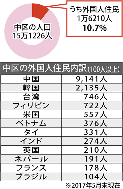 中区の人口のうち約11%が外国人であり=グラフ=、市内18区でその比率は一番高い(全国の自治体でも5番目)。また、外国人の転入割合が約5割で、初めて日本に住む人の割合が高いのも特徴だ。地区でみると割合が高いのが南区と接する第1中部(23%)と埋地(18%)、中華街を含む第2(17%)と続く。