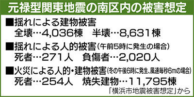 横浜市がこのほど発表した地震被害想定で、震度6強から7の最大規模の地震の場合、南区内で建物全体の27%にあたる約1万2千棟が全壊か半壊するとし、倒壊によって271人の死者が出るとされた。これを受け、南区役所では、以前から取り組んできた「減災」により力を入れていく方針だ。