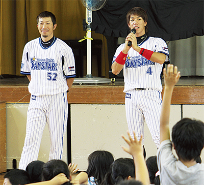 横浜DeNAベイスターズの多村仁志選手と荒波翔選手が7月9日、南吉田小学校(藤本哲夫校長)を訪れ、「夢」について語り合う授業を行った。