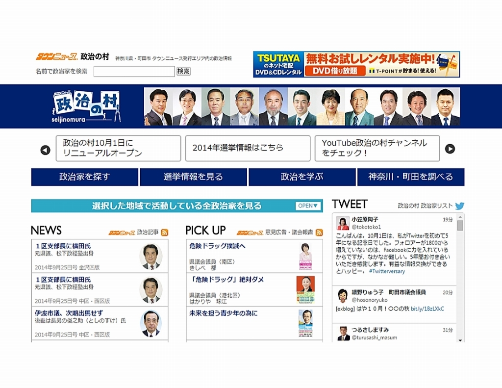 タウンニュース社が運営するサイト「政治の村」(http://seijinomura.townnews.co.jp/)が10月1日にリニューアルしました。このサイトでは発行エリアである神奈川県と東京都町田市の政治家、約1,000人のプロフィールなどを紹介しています。今回のリニューアルで、まちの政治家が一目で分かるようにしました。また、タウンニュース紙面に掲載されている政治関係記事や各政治家の議会報告なども自治体ごとに閲覧できるよう集約し、今までよりも情報量を増やしました。さらに、これから政治家を志す人物のデータベースや、意見・主張を閲覧できる機能も追加し、