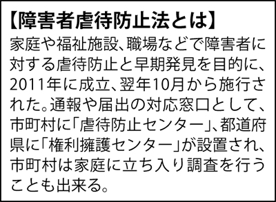 これは12年10月に施行された障害者虐待防止法(以下、防止法)に基づき、市と県がまとめたもの。厚生労働省が実施した全国の調査発表に合わせ、県内市町村分が集計された。これまで防止法施行から13年3月までの6カ月間の実態が発表された経緯がある。