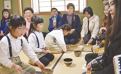 見学会では、同園の田野岡由紀子園長が区内唯一の認定こども園である施設の機能や教育方針などを説明。その後、同園で取り入れる茶道教育を視察団が体験する場面では、園児が丁寧に日本茶を持って「おもてなし」する姿も見られた。