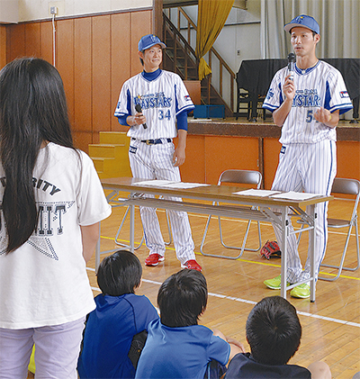 市立南小学校(田中弘子校長)で6月19日、横浜DeNAベイスターズの小杉陽太選手と平田真吾選手が訪問授業を行った。