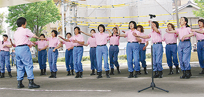 12日の訓練会は団員が日ごろの訓練の成果を発揮する場。町内会関係者らが見守る中、小型ポンプを使った放水などが披露された。その後に登場した声楽隊の32人は、この日のために用意したピンク色のポロシャツを着用。テープ伴奏に合わせ、横浜市歌と岡本真夜さんの「TOMORROW」の2曲を二部合唱した。