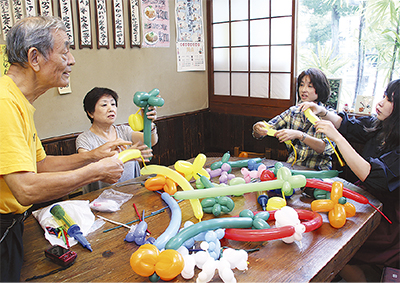 横浜橋通商店街のとんかつ店「梅月」では15日、アメリカンバルーン教室が開かれた。店主の山本洋さんが趣味で10年以上続けているバルーン作りの技術を指導。細長い風船をねじってプードルやぶどうを作った。参加者からは「子どもにあげたら喜びそう」などの声が出ていた。同店は22日午後2時30分からもバルーン教室を行う。また、本業の揚げ物のコツを伝授する講座を10月6日に開く予定。申し込みは同店【電話】045・243・2812(午後7時〜9時)。