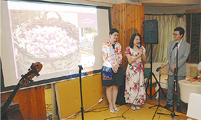 山下理事長や駐日ブルガリア共和国大使館のイリヤナ・コストヴァさんらがブルガリアのローズについて説明。山下理事長は「ブルガリアでは、親しい人の間でバラの花を贈る習慣もある」とバラの存在がコミュニケーションを図ることにもつながっているとした。