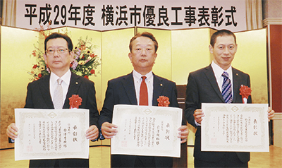 井土ヶ谷下町の電気設備工事業、向洋電機土木株式会社(倉澤俊郎社長)が昨年度完成した横浜市発注の工事のうち、建築局と環境創造局関係のもので、それぞれ出来ばえなどで最高の評価を得て、11月2日に市から表彰を受けた。両工事の現場責任者を務めた倉澤社長と弟の秀俊専務がきょうだいで受賞した。