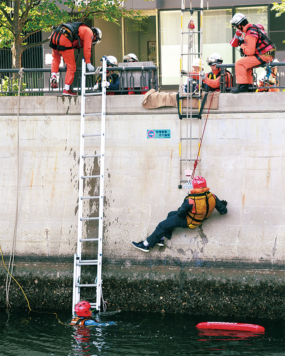 7月19日は消防署そばの中村川を使い、川で溺れた人を救助する訓練を実施。水難者を発見した救助隊員が手すりにロープを縛り付け、それを頼りに川の中に入り、抱きかかえるように助けた。その後、壁まで誘導し、救助器具を取り付け、ロープで地上まで約4mを引き上げた。