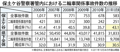 今年1月から10月末までに同署管内で発生した二輪車関係事故件数は、251件(概数)。これは、全事故件数の43・1%を占め、県下平均の30・5%に比べて高くなっている。対して自転車関係の事故の占める割合は12・5%と県下平均の24・8%を下回っている。