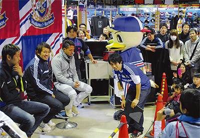 星川駅近くにある用品店「アンドウスポーツ」に12月14日、横浜F・マリノスの栗原勇蔵選手と兵藤慎剛選手、比嘉祐介選手が招かれ、地域住民らと交流するミニイベントが行われた。