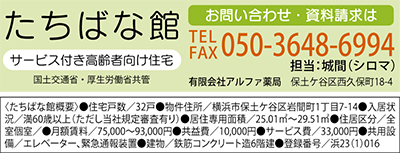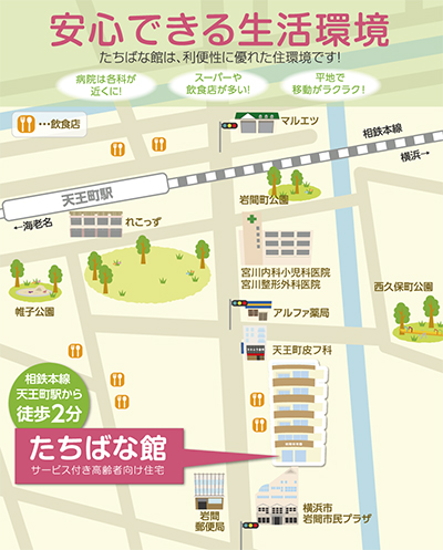 60歳以上であれば、1人でも安心して入居できる新しいタイプの賃貸マンションとして、相鉄線「天王町駅」そばに昨年完成した『サービス付き高齢者向け住宅・たちばな館』。同所は「安全や快適性、安心の備え」と「プライベート」を両立させる館内の設備やアメニティ等の魅力に加え、利便性に優れた住環境も特長の一つ。さらに、街ぐるみでお年寄りを見守ろうという取り組みなども進んでおり、理想のセカンドライフを実現可能な施設として現在、大きな注目を集めている。